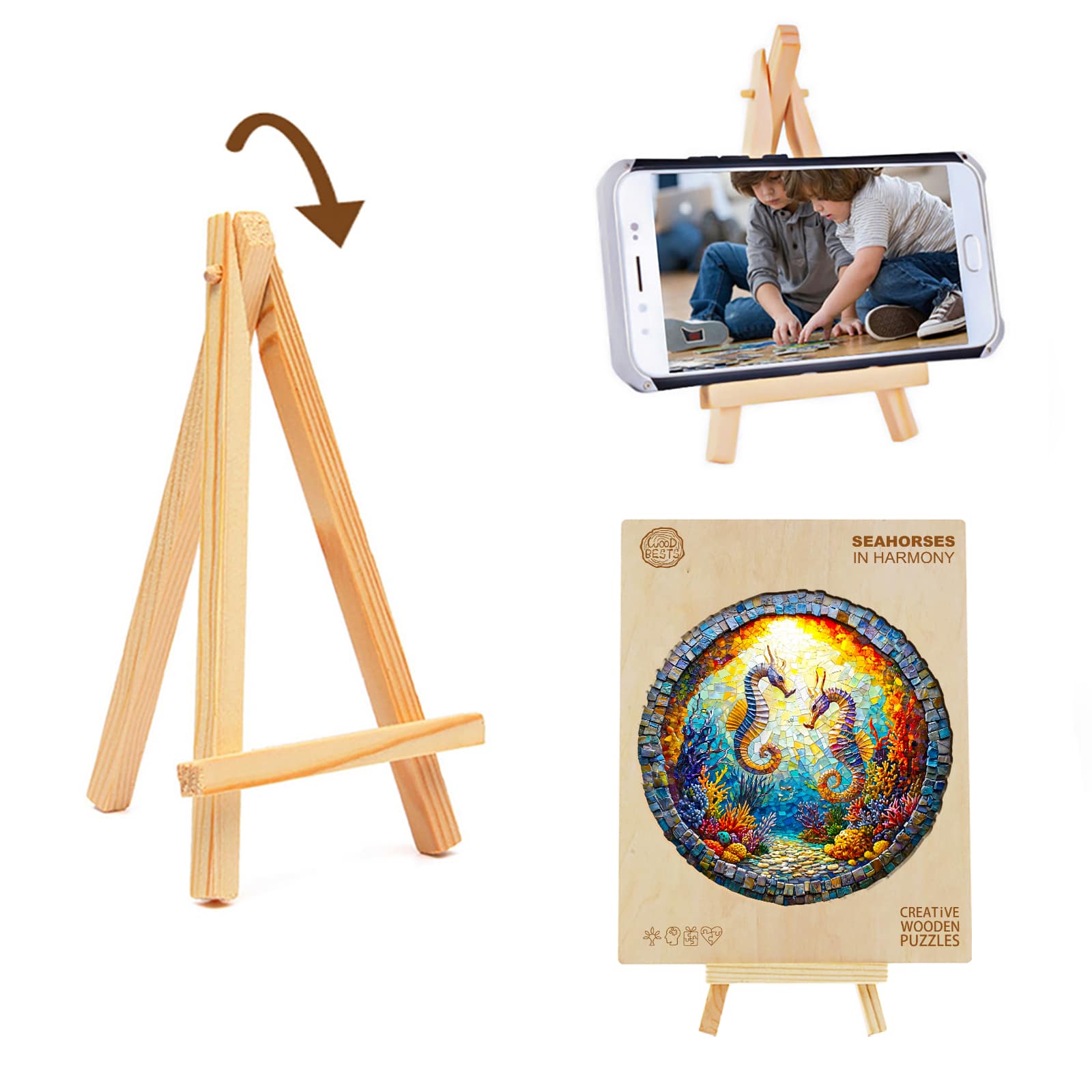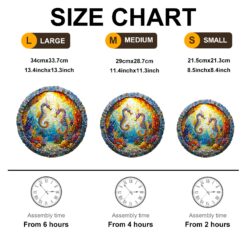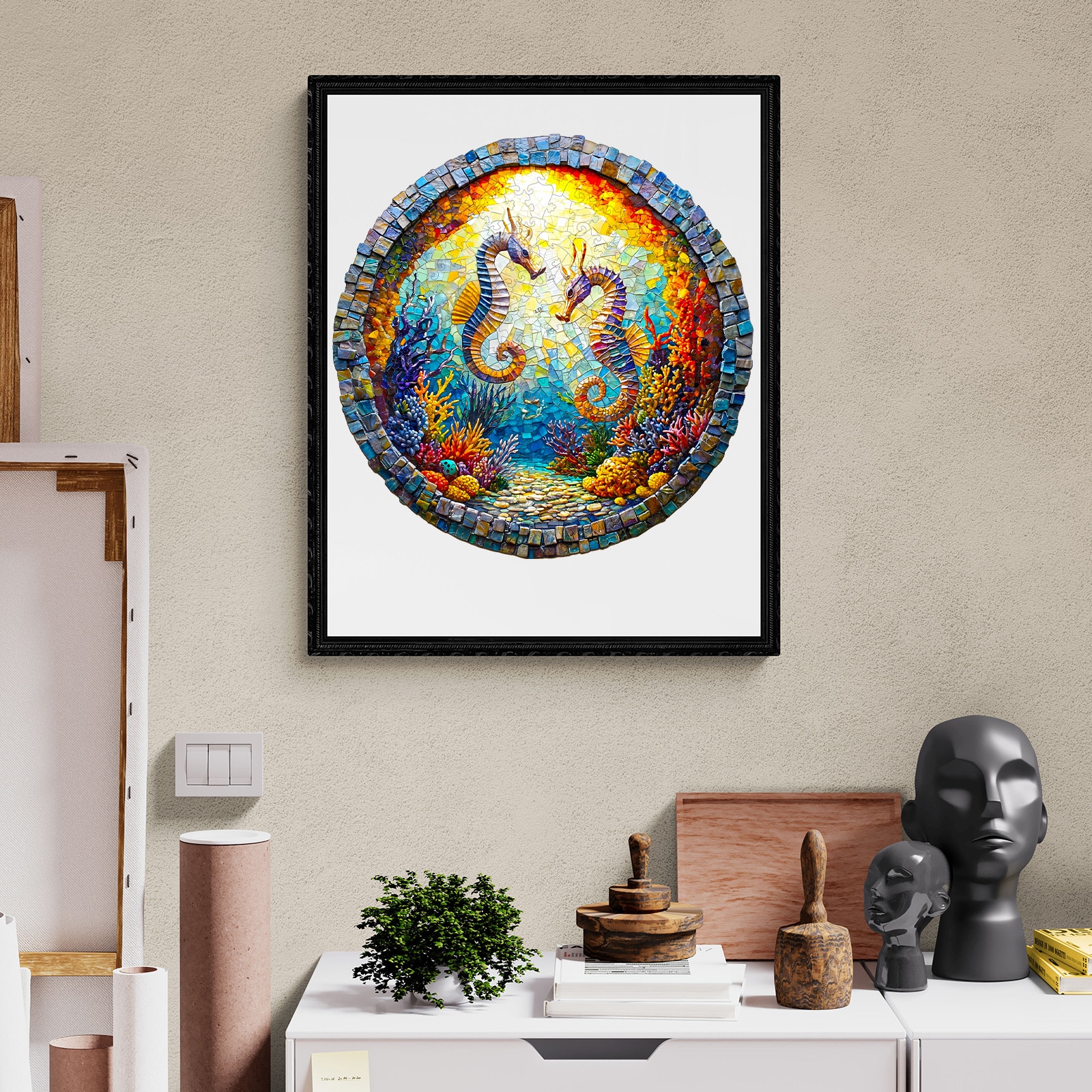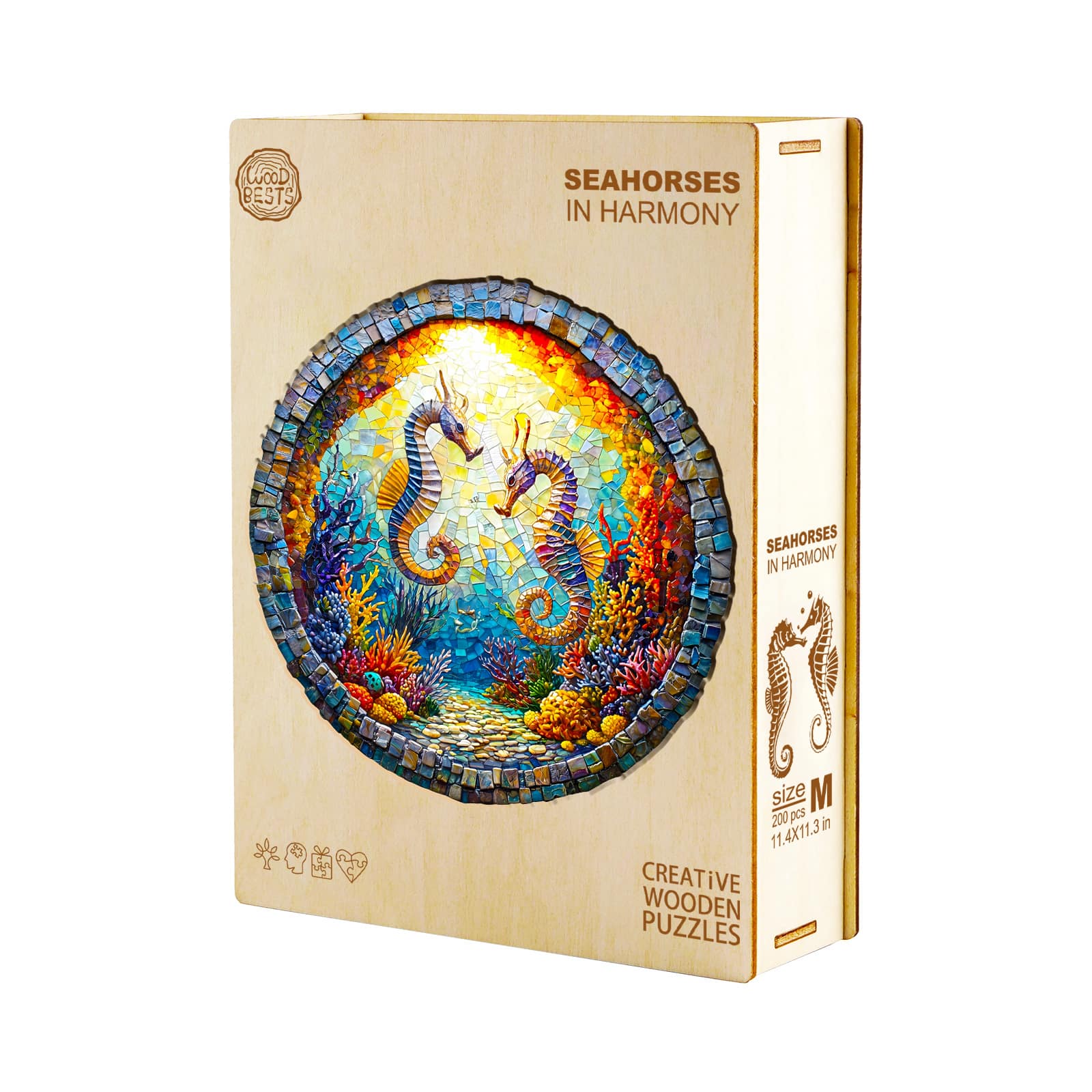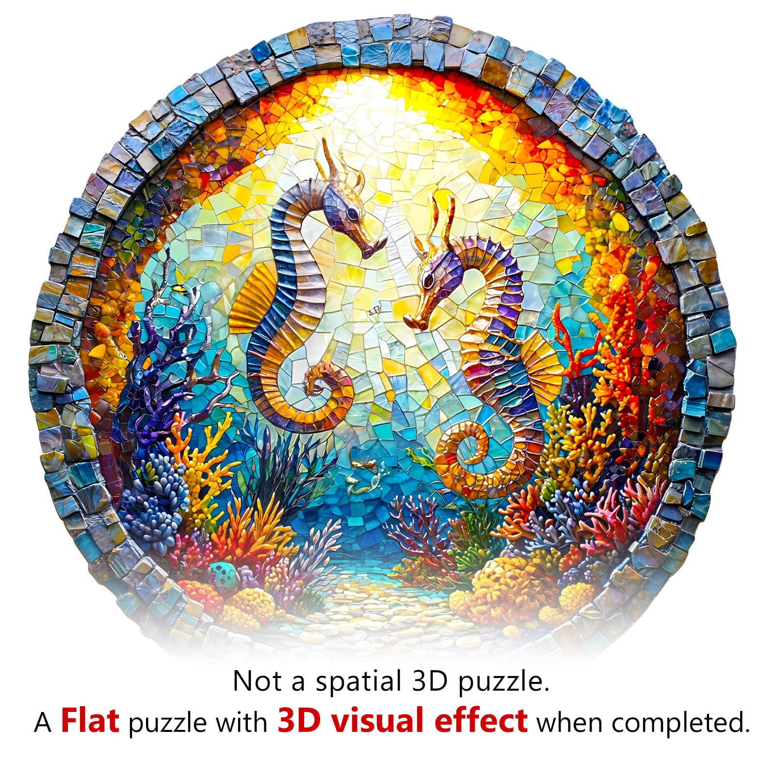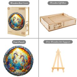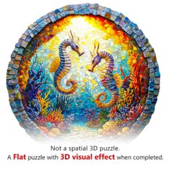 This image showcases a round wooden jigsaw puzzle depicting two seahorses facing each other in a vibrant underwater coral reef. The design resembles a mosaic, with rich, colorful details of marine flora and fauna illuminated by a radiant sunlit backdrop. The intricate cuts and vivid artistry make this puzzle a visually stunning and enjoyable activity for puzzle enthusiasts.