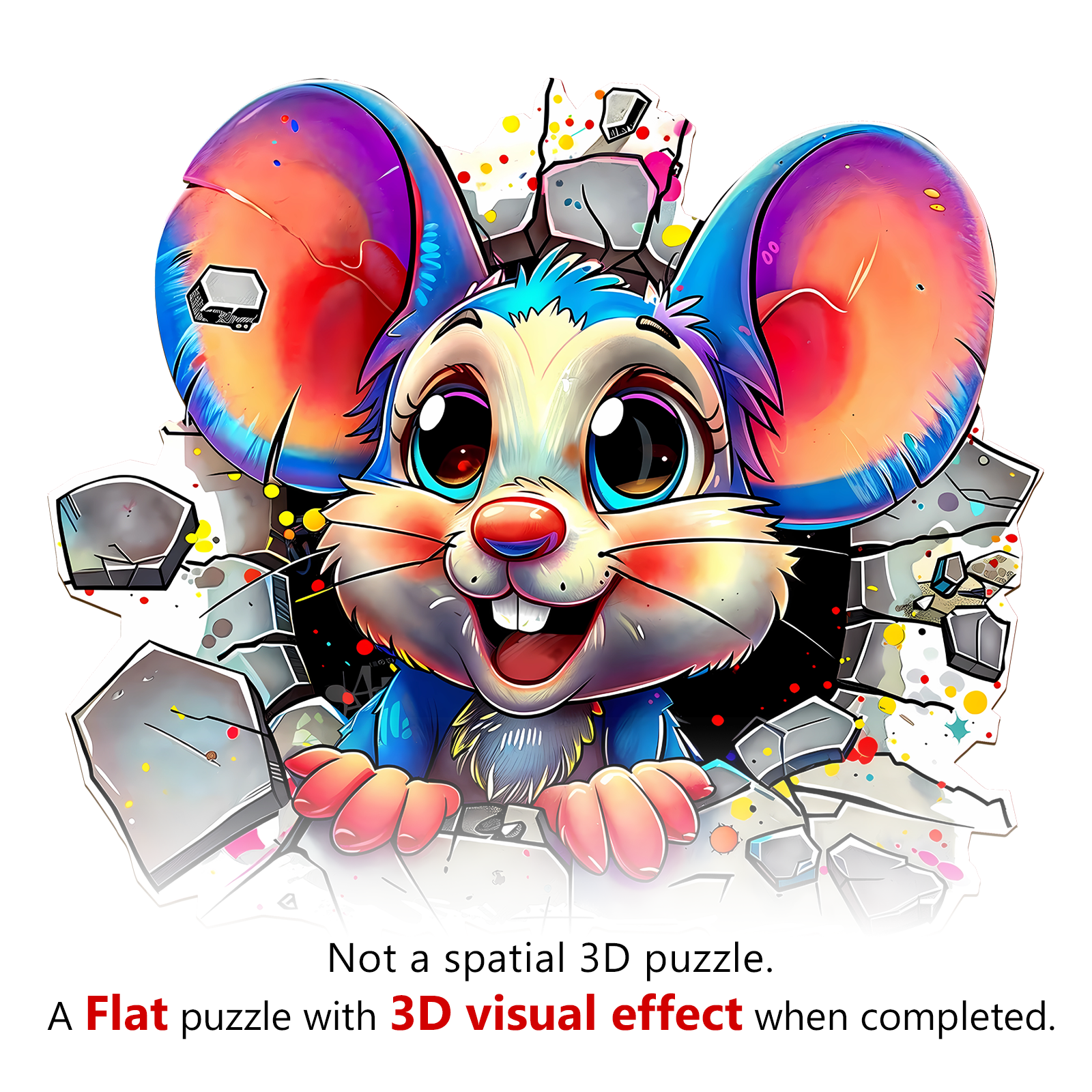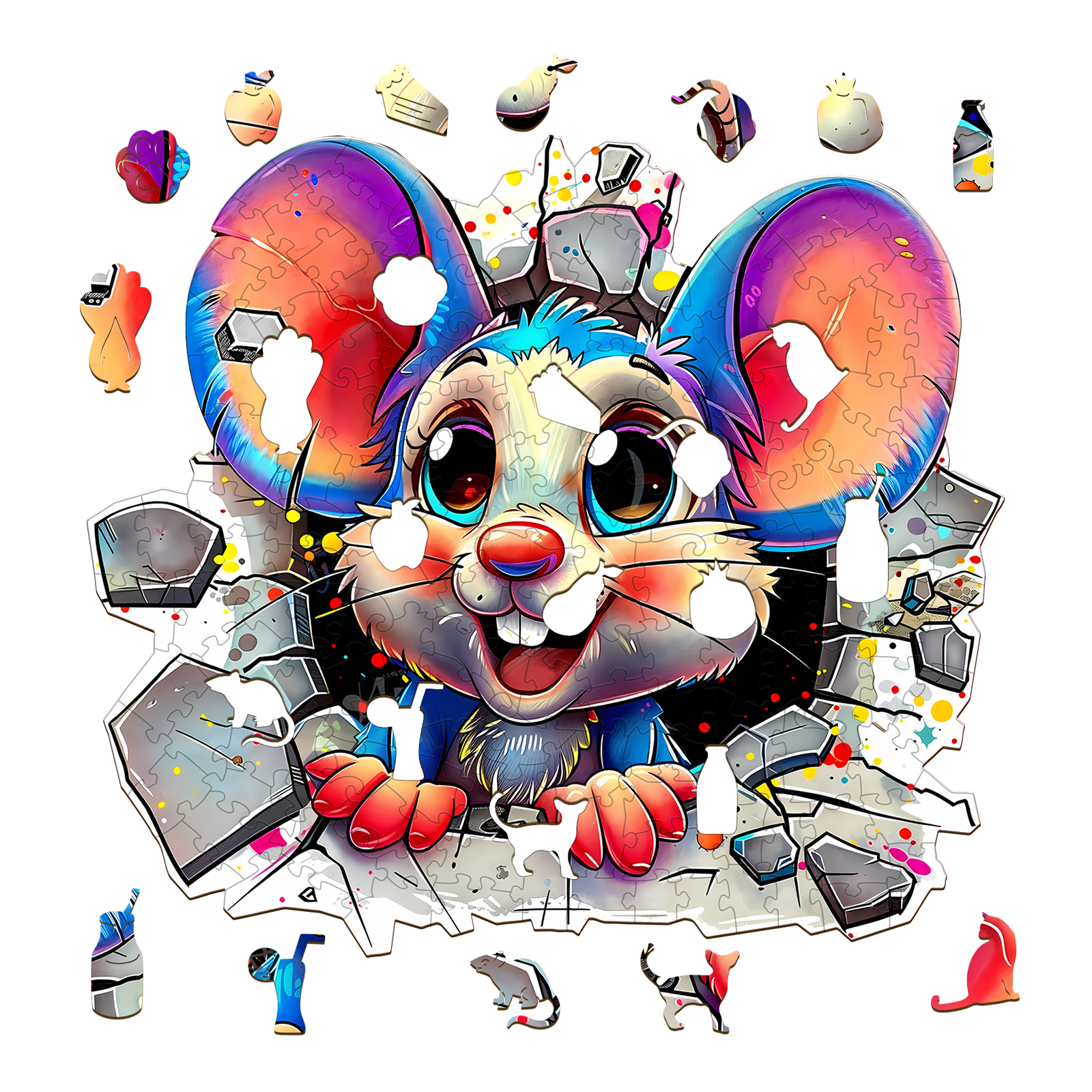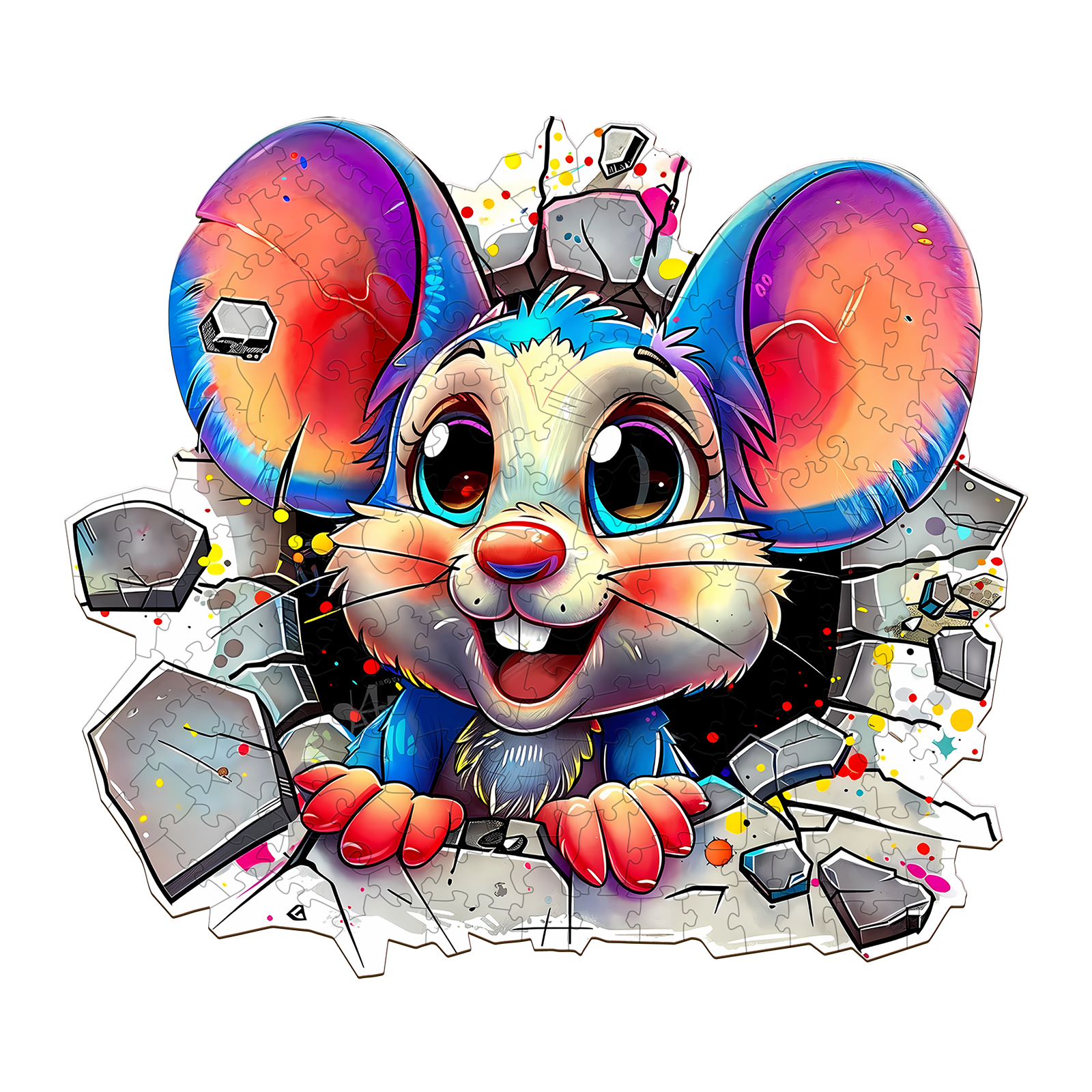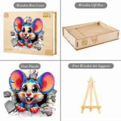 Brighten your day with this delightful Kaayee Wooden Puzzle featuring an adorable cartoon mouse bursting through a wall with vibrant energy! With its oversized ears, sparkling eyes, and playful expression, this whimsical character brings joy and excitement to puzzlers of all ages.