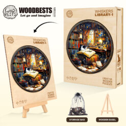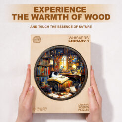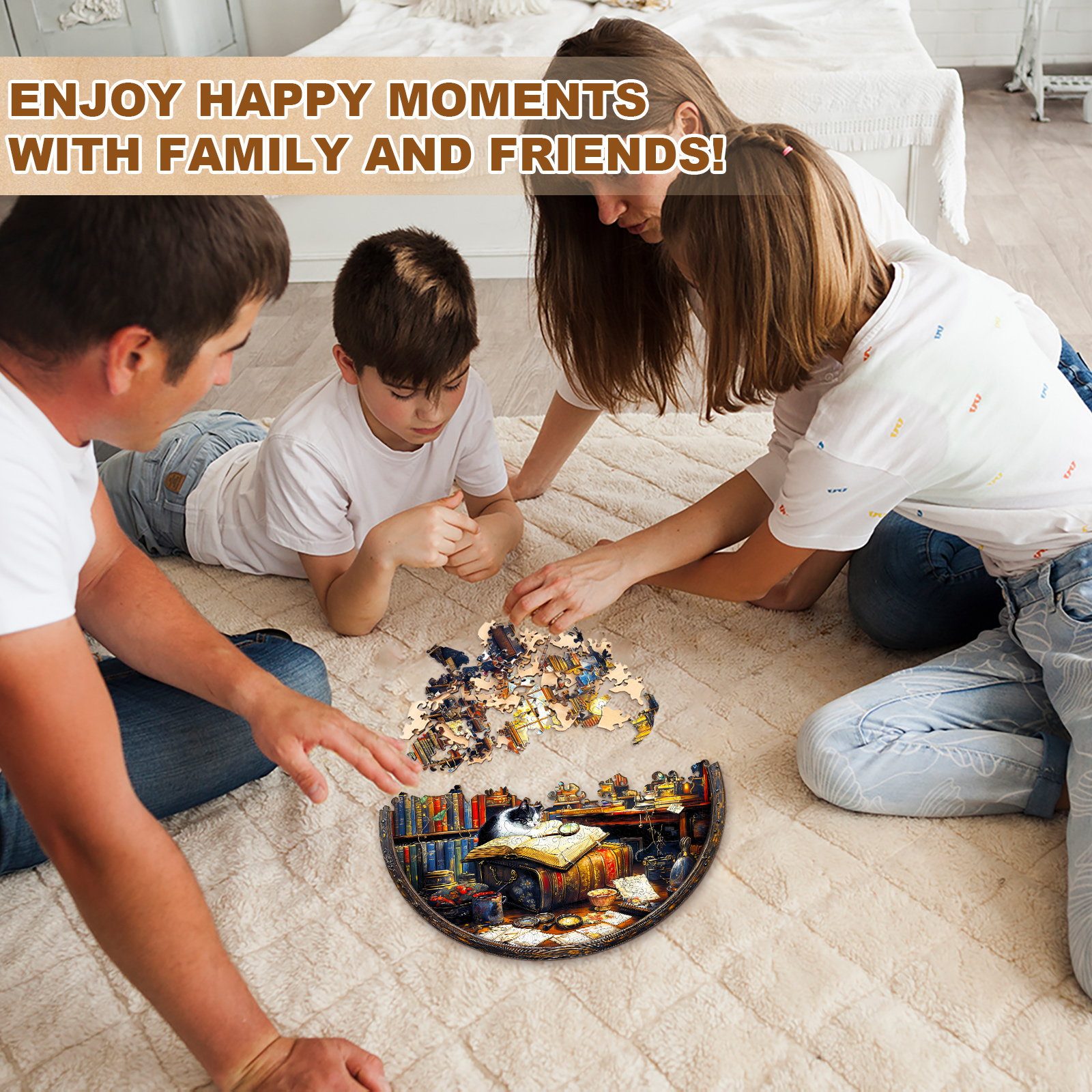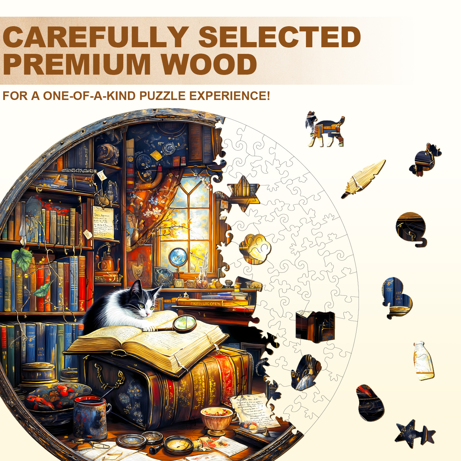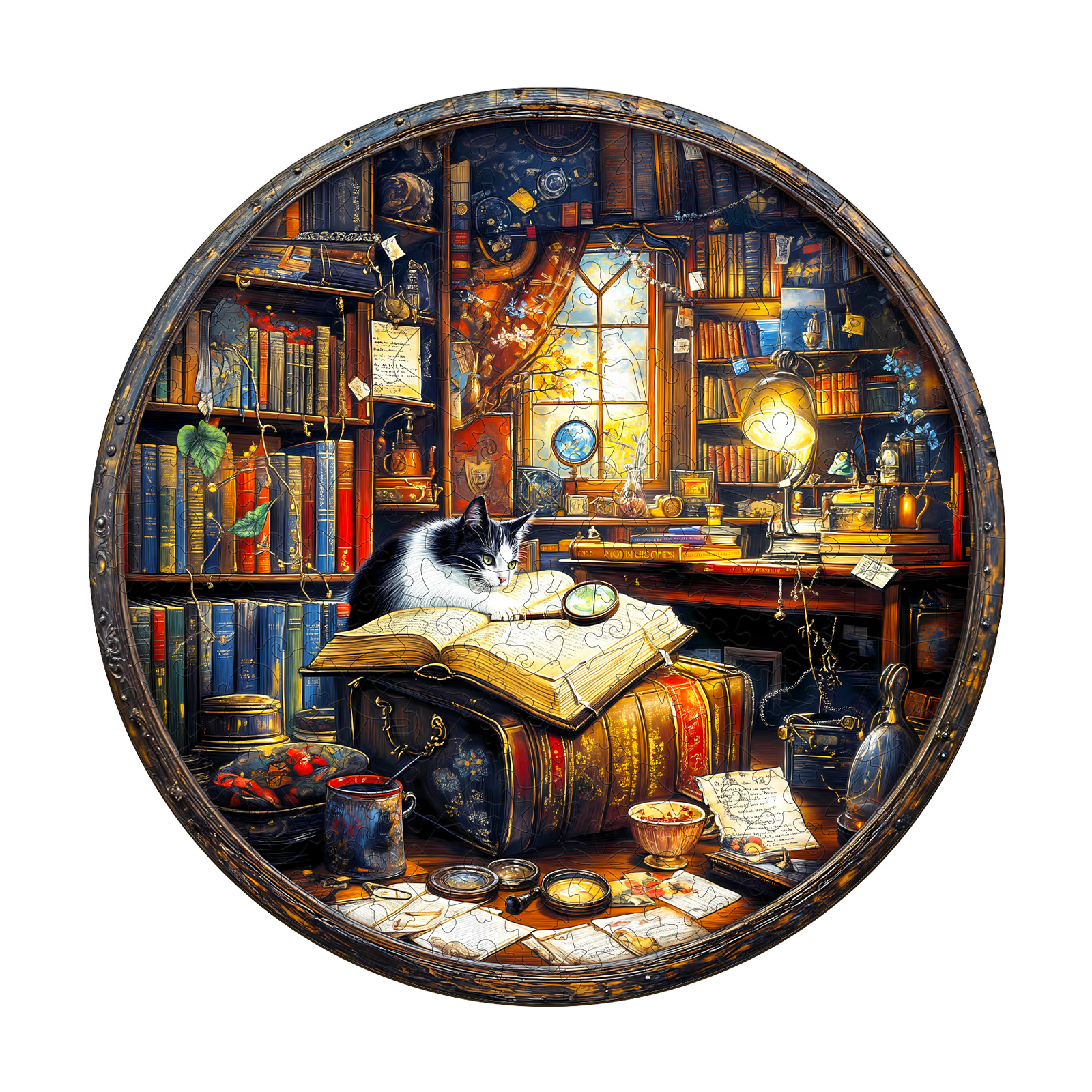 Step into a world of mystery and charm with the Kaayee Wooden Jigsaw Puzzle, featuring a captivating round design of a cozy scholar’s study. At the heart of the scene, a curious black-and-white cat rests atop an open book, surrounded by magnifying glasses, ancient tomes, handwritten maps, and warm lamplight streaming through a window. Every detail—from the rich colors of the bookshelves to the scattered vintage trinkets—invites you to lose yourself in the intricate artistry. Crafted from premium wood, each piece fits perfectly, offering a delightful challenge for puzzle lovers and a stunning work of art to display once completed.