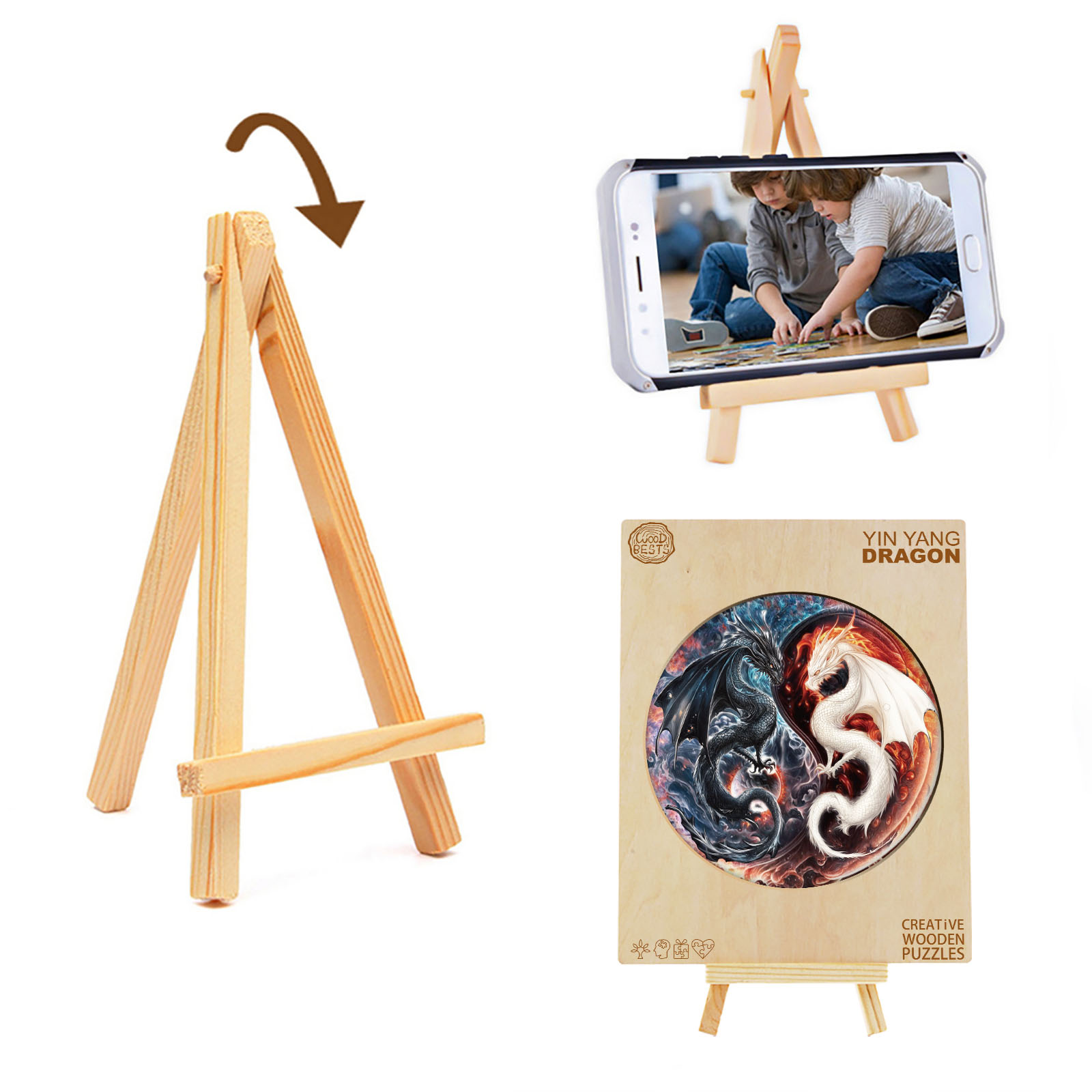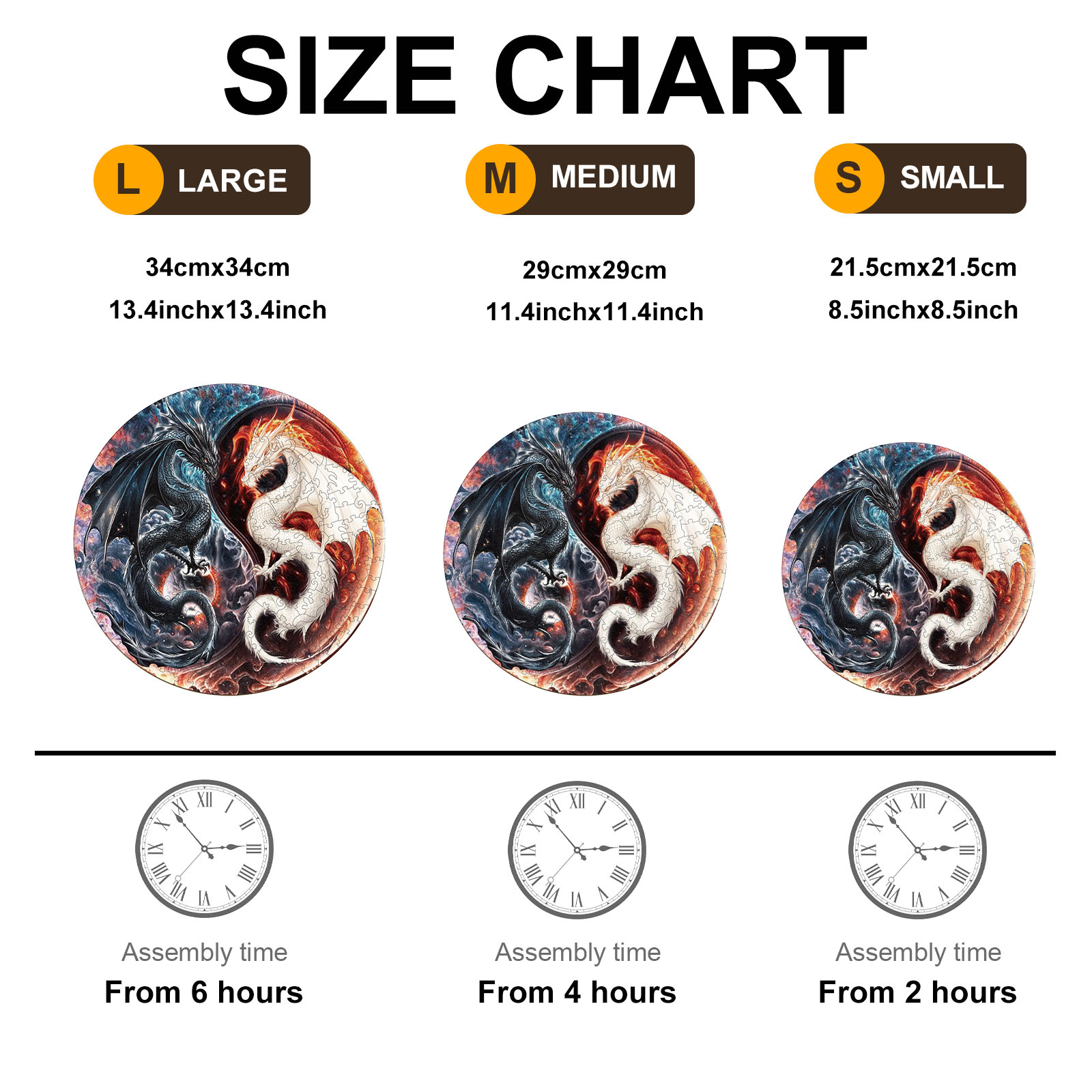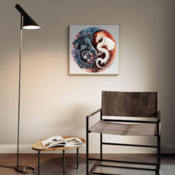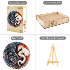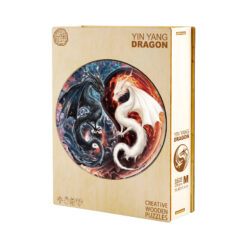 This exquisite wooden puzzle features a stunning circular design showcasing two intricately illustrated dragons—one dark and one light—entwined in a dynamic yin-yang formation. Crafted with precision-cut wooden pieces, the puzzle not only offers a challenging and satisfying experience but also becomes a captivating work of art when completed. The detailed artwork, rich in fiery reds and cool blues, highlights the powerful contrast and harmony between the two mythical creatures, making it a perfect gift for dragon lovers and fantasy enthusiasts alike.