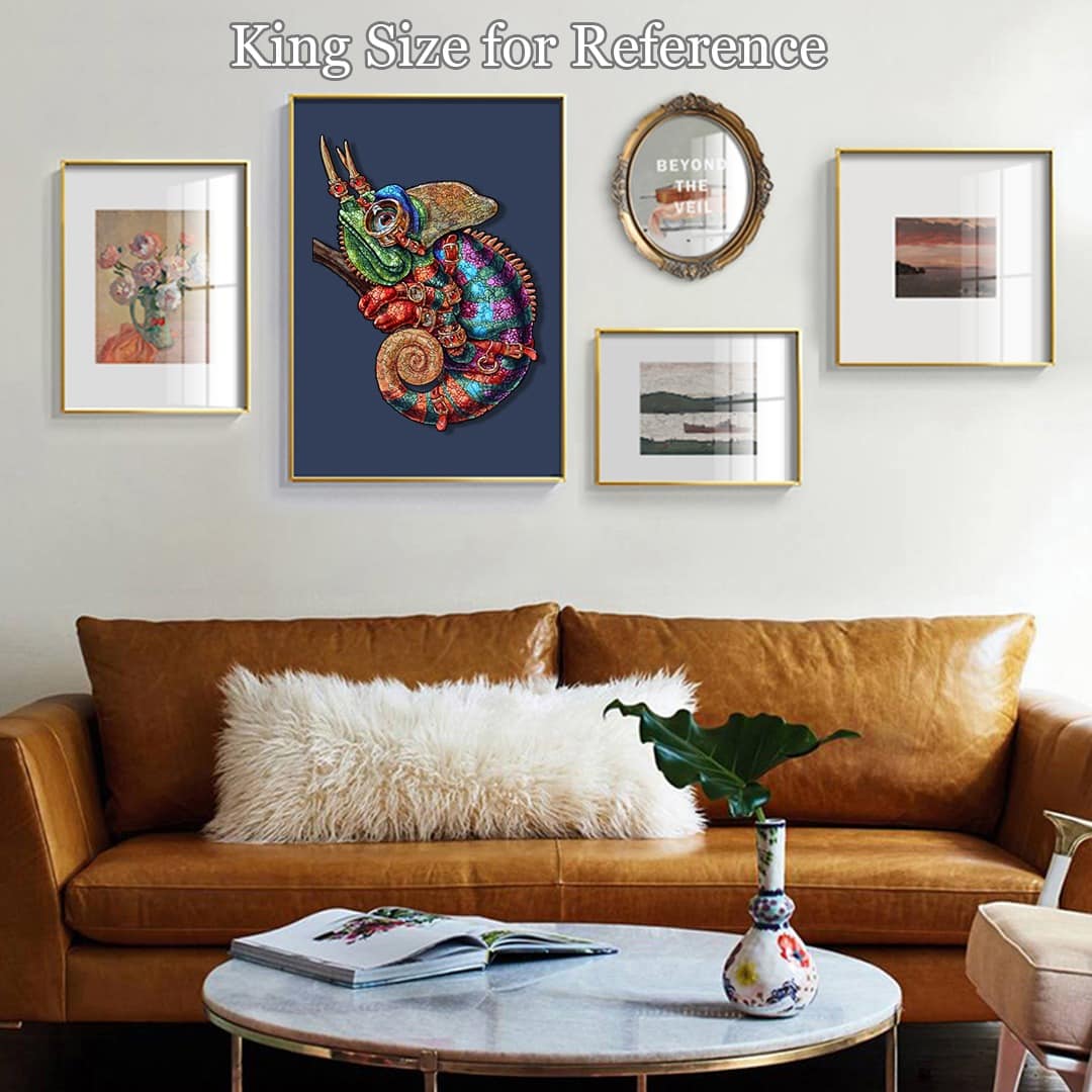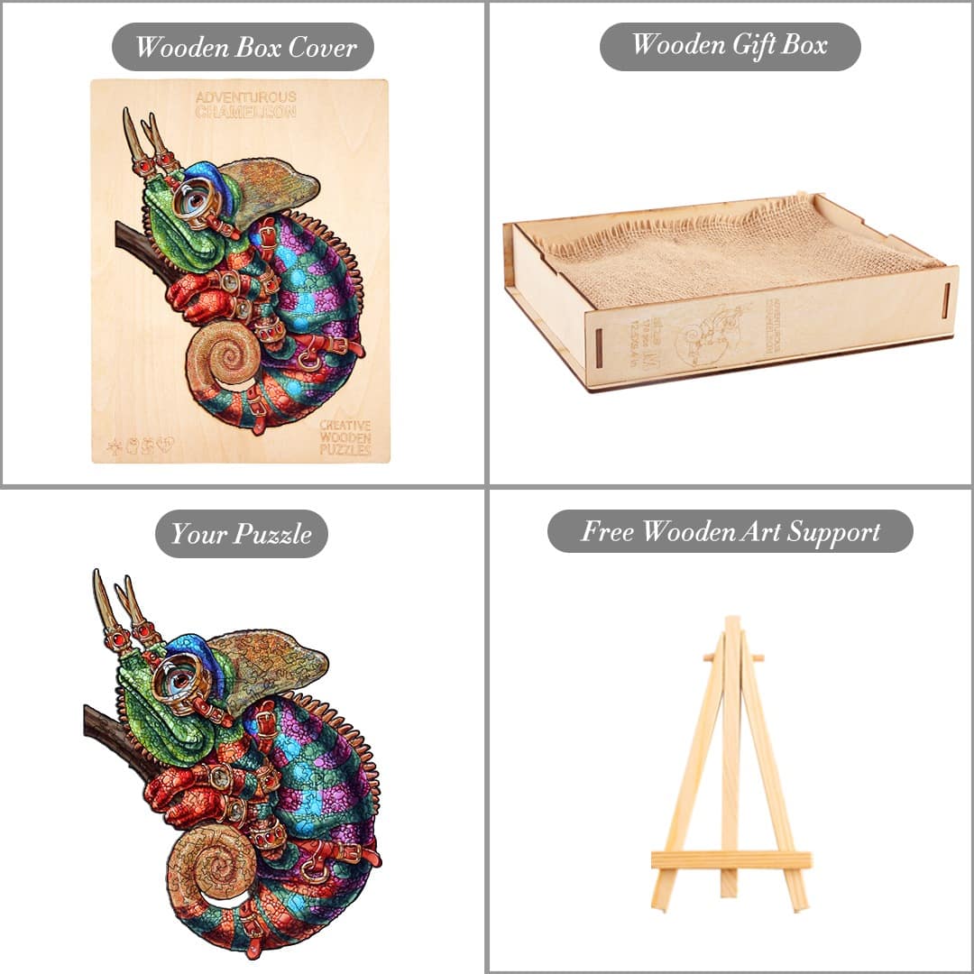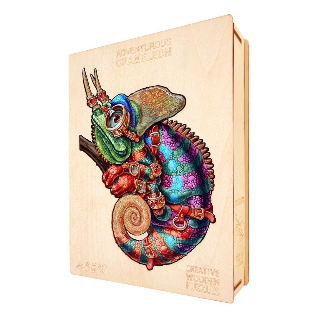 The “Adventurous Chameleon” wooden jigsaw puzzle by Kaayee is a vibrant and intricately designed puzzle featuring a colorful chameleon in a lush, jungle-inspired setting. Made from premium wooden pieces, it combines challenging assembly with artistic beauty. The puzzle likely includes uniquely shaped pieces, making it both an engaging activity and a decorative collectible when completed. Ideal for puzzle enthusiasts of all ages.