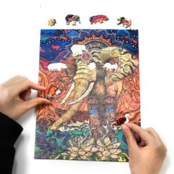 I loved this small, artistic, vibrant puzzle of a lion’s head! Since there were many complaints about missing pieces, I counted that there were 100 pieces before I began putting it together. Due to the nature of working with wooden pieces that are unusually shaped and do not click into a locked position easily, I found this challenging to put together and and even more challenging to glue it in an effort to preserve it for framing. With my best efforts using a thin white glue recommended for puzzle preservation and gentle and multiple applications with a brush, the puzzle shifted apart somewhat, leaving the gaps that are seen in this photo. However, it still looks good when not held up to the light and is frame worthy!!