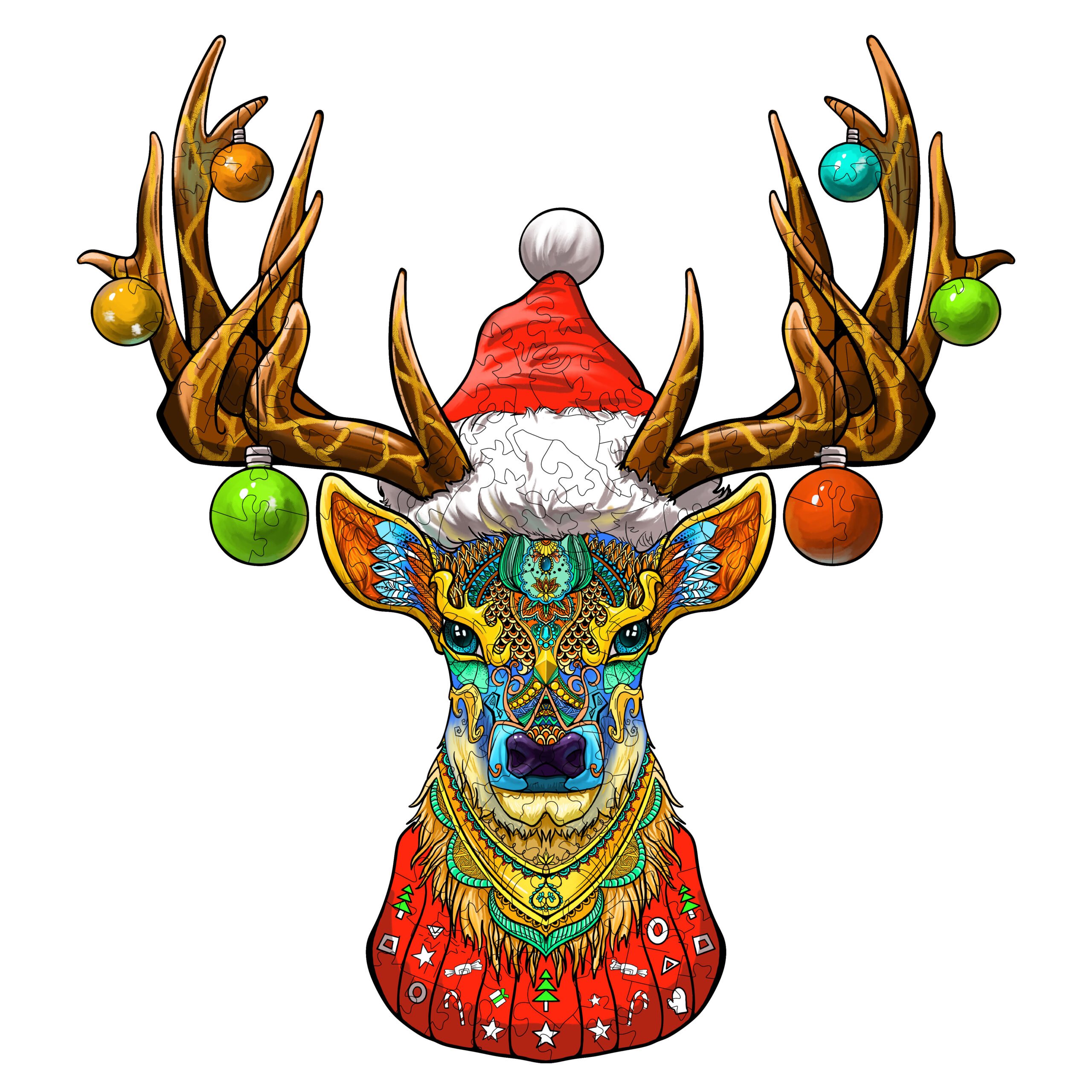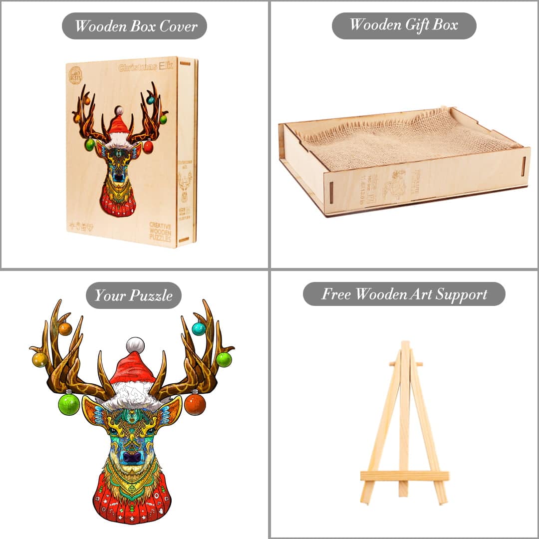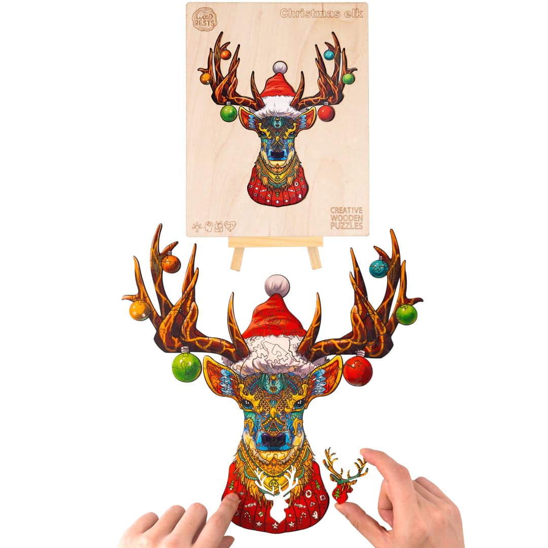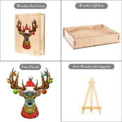 Celebrate the season with the “Christmas Elk” wooden jigsaw puzzle, a festive masterpiece featuring a colorful, intricate elk design adorned with holiday ornaments and a Santa hat. Made from high-quality wood, each piece is carefully crafted for durability and enjoyment. This 300-piece puzzle is perfect for holiday decor or a cozy family activity, adding a touch of artistic charm to your Christmas festivities.