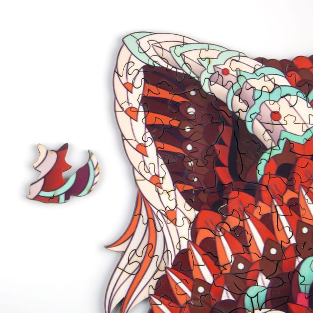 If you’ve never experienced a well-made wooden jigsaw puzzle, you might be wondering why people would spend so much money on them. The answer is that it’s an experience completely unlike any ordinary cardboard jigsaw puzzle. It fiercely resists every form of methodical approach you might try with an ordinary puzzle, such as finding the edge pieces first, sorting by color, or sorting by shape. Instead, it invites you to just sit with it, let your eyes rove, enjoy the beauty and intricacy of each piece, and enter a sort of meditative state. Trying to actively search for a specific piece nearly always proves fruitless – it simply reveals itself when your eyes are ready to see it.