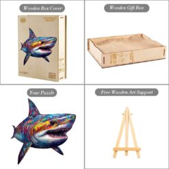 If you are looking for a challenge, go ahead and purchase this. I enjoyed the creativity of this product a lot. It came in a small wooden box with about 100 wooden puzzle pieces. I love that some of the puzzle pieces are different types of sharks. I plan on purchasing more of these puzzles.