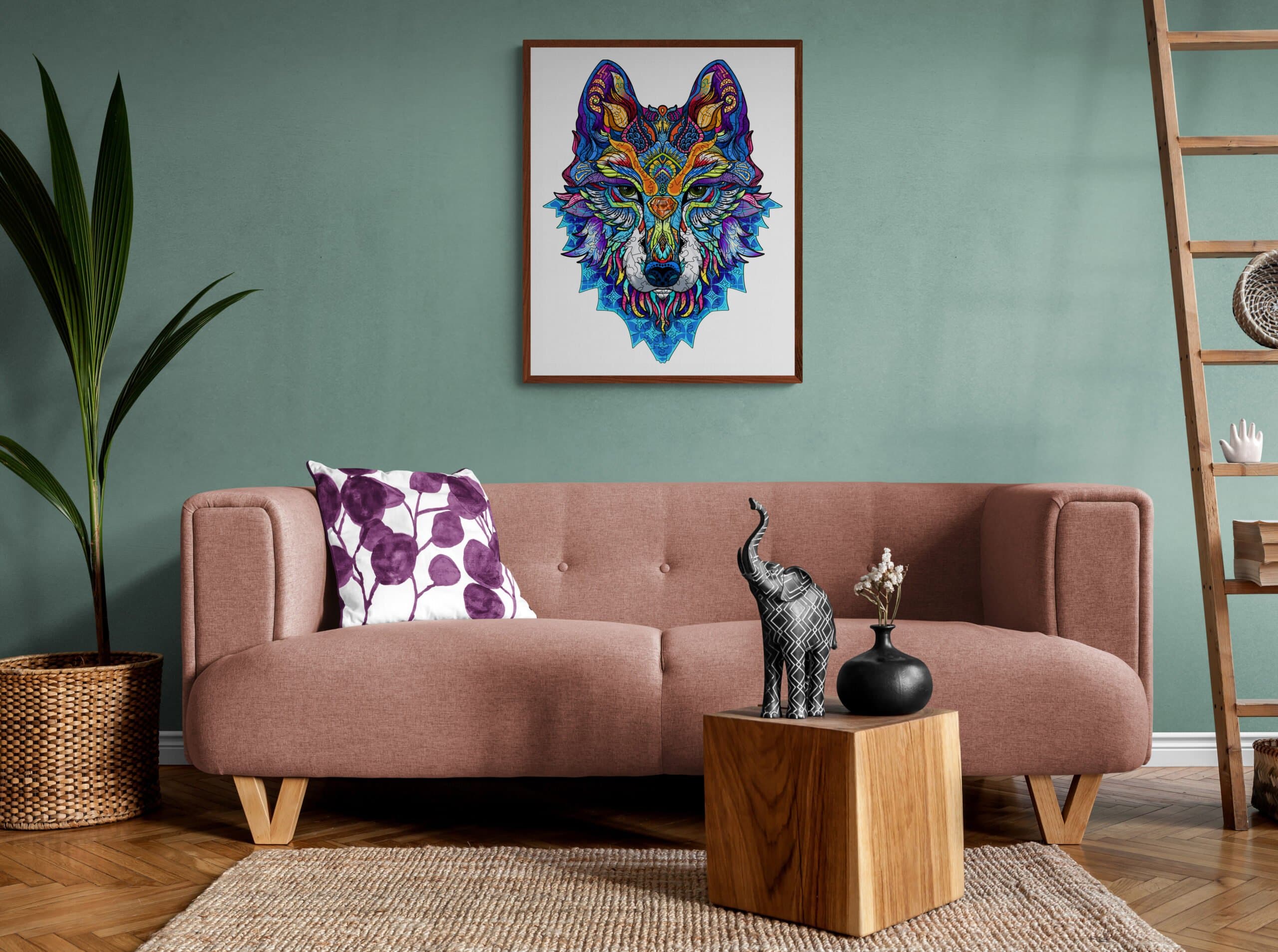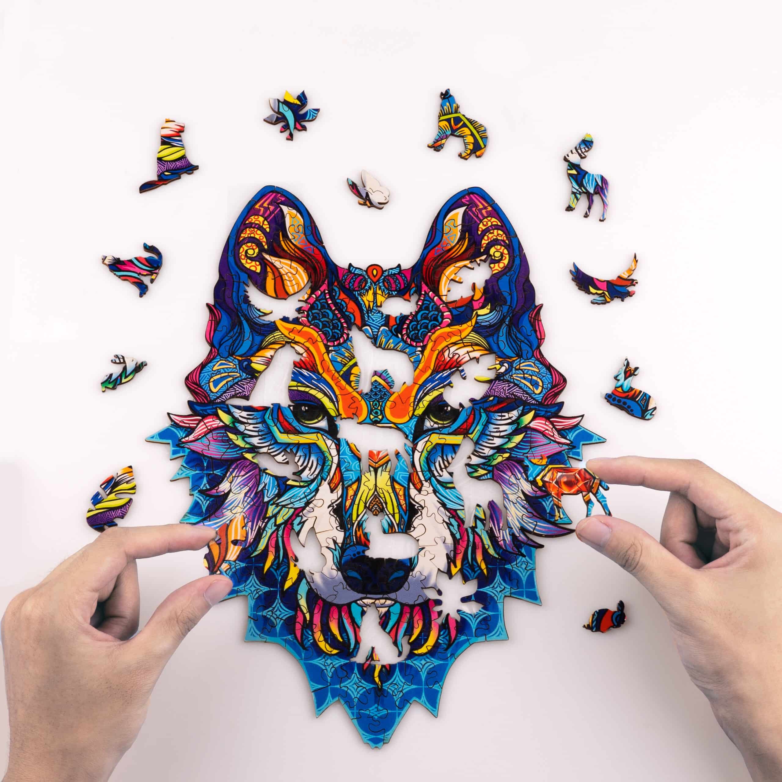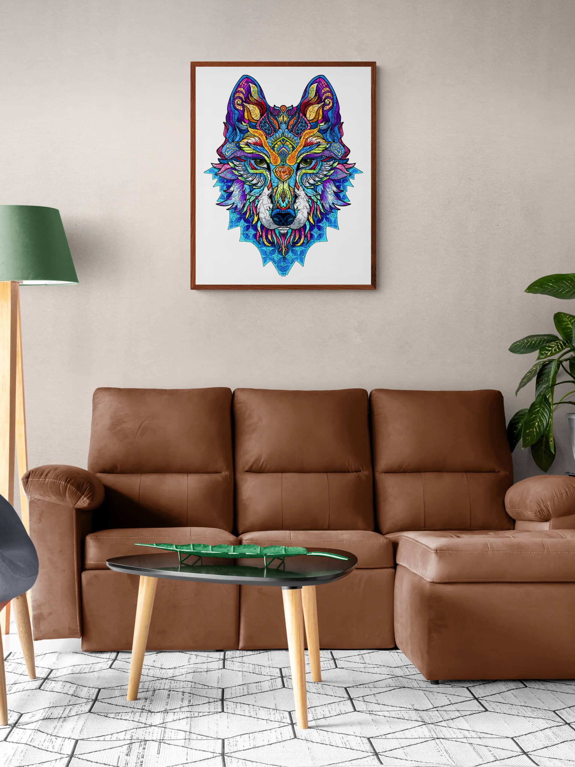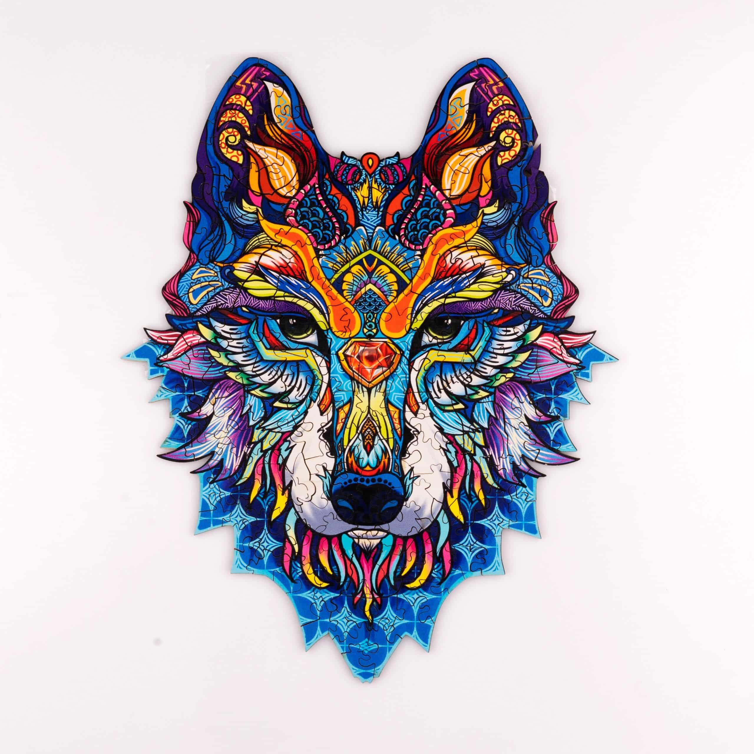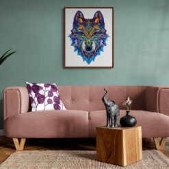 This stunning wooden jigsaw puzzle features a vibrant and intricate design of a majestic wolf. With its colorful patterns and detailed artwork, the puzzle pieces are uniquely shaped to enhance the experience, making it a fun and engaging challenge for all ages. Crafted from high-quality wood, this puzzle is both durable and visually striking, perfect for nature lovers and puzzle enthusiasts alike. It also serves as a beautiful decorative piece once completed.